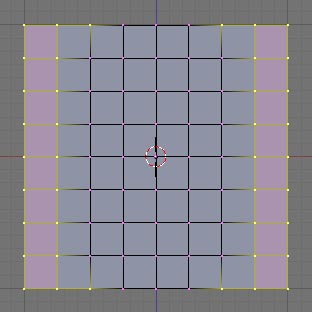 Wir öffnen Blender und löschen des Standard Cube. Wir wechseln in die Frontansicht <1> des Nummernblocks und fügen mit der Leertaste->Add->Mesh eine Plane ein. Diese Fläche wird nun im Edit-Mode <TAB> dreimal Unterteil mit <w> Special->Subdivide. Vertices wie in der Abb. Entsprechend markieren (2x<B>) und dann mit <Entf> Erase->Vertices löschen.
