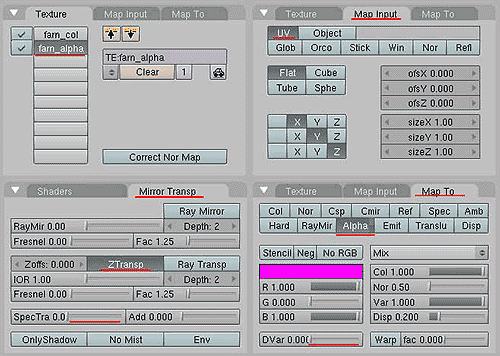 Um die Alpha Textur einzufügen gehen wir wie im vorherigem Punkt vor. Mit <F6> wechseln wir wieder zu den Texturbuttons und wählen den leeren Texturkanal unterhalb des fran_col Button. Auch hier fügen wir mit Add new einen neuen Layer ein, welchen auf farn_alpha umbenannt werden sollte. Mit dem Load Image Button laden wir nun „fran_alpha.jpg“, die Button Interpol und MipMap können wir wieder deaktivieren. Da wir die textur für den Aplhawert verwenden wollen aktivieren wir den Button CalcAlpha, wie man in der Voransicht erkennen kann ist nun das Blatt transparent, also genau verkehrt herum, um dies zu ändern aktivieren wir den nebenstehenden Button NegAlpha. Im Shadermenü <F5> führen wir nun die entsprechenden Einstellungen gemäß der Abbildung durch.